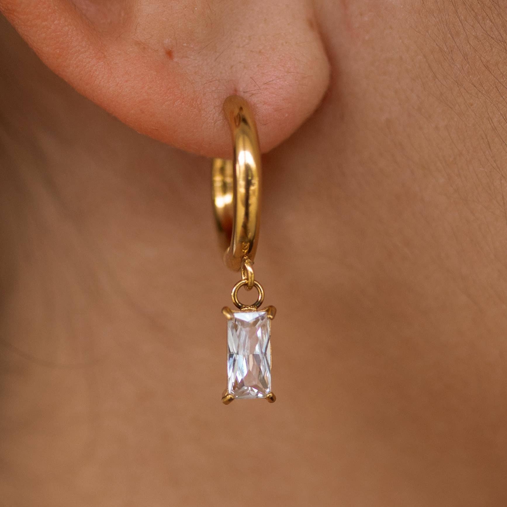 Meet the Aria Huggie - a must-have piece for every jewelry collection. This sleek and stylish earring features a simple gold huggie adorned with a dangling baguette-cut stone. Effortlessly chic and versatile, the Aria Huggie can be dressed up or down to elevate any look.