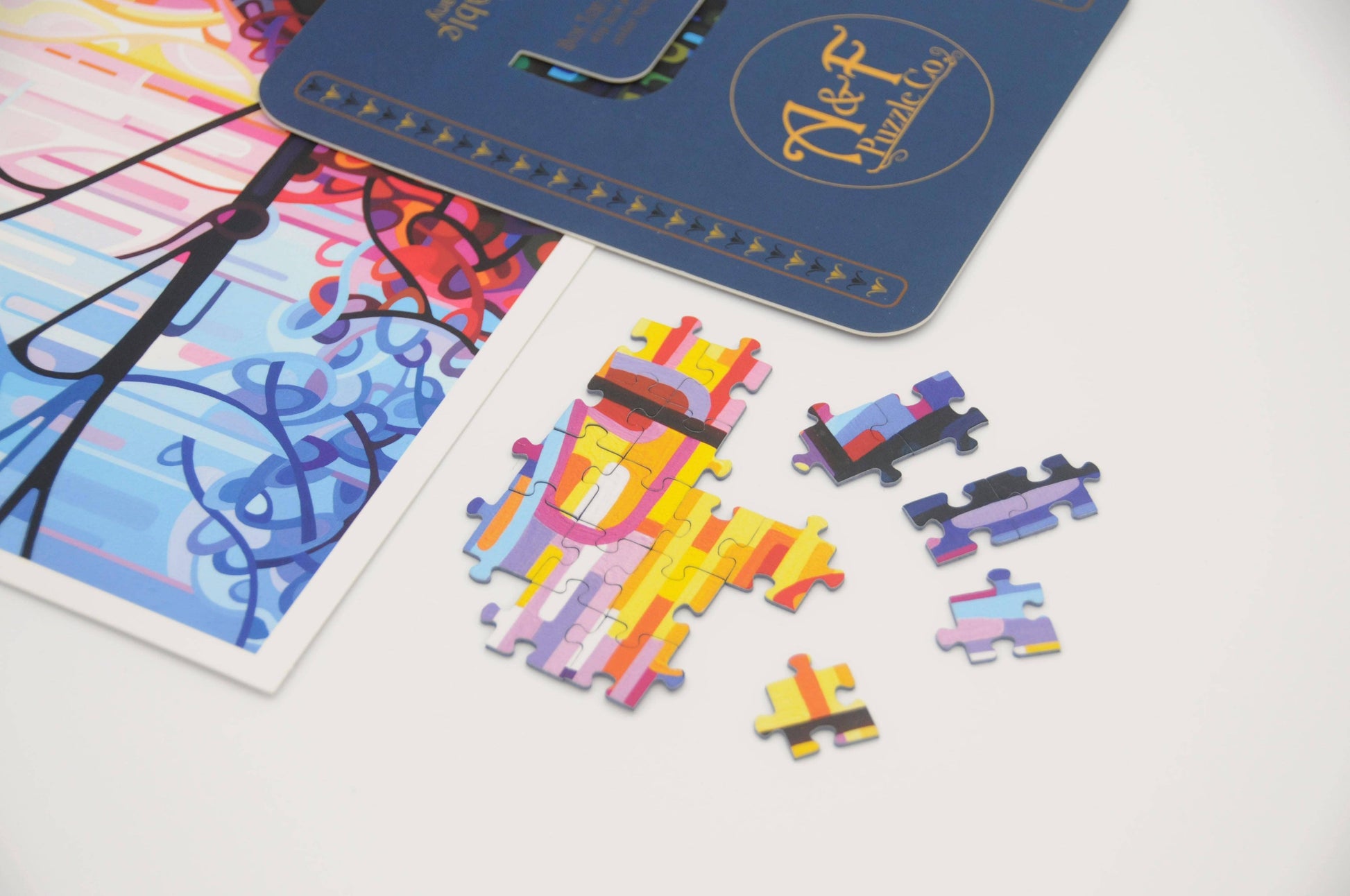 AWAKENING has been awarded Best Puzzle of 2020 by the largest social media group for puzzles, The Puzzle Pals! Art & Fable Puzzles are designed to display beautifully on a shelf while using minimal space. Display assorted titles like books, showing off their colorful bindings. This particular feature retailers and puzzle collectors love! In her abstract landscapes, Mandy Budan rearranges the elements of nature. She uses strong color, discrete shapes and rhythmic patterns to reveal the beauty of nature in unexpected ways.
