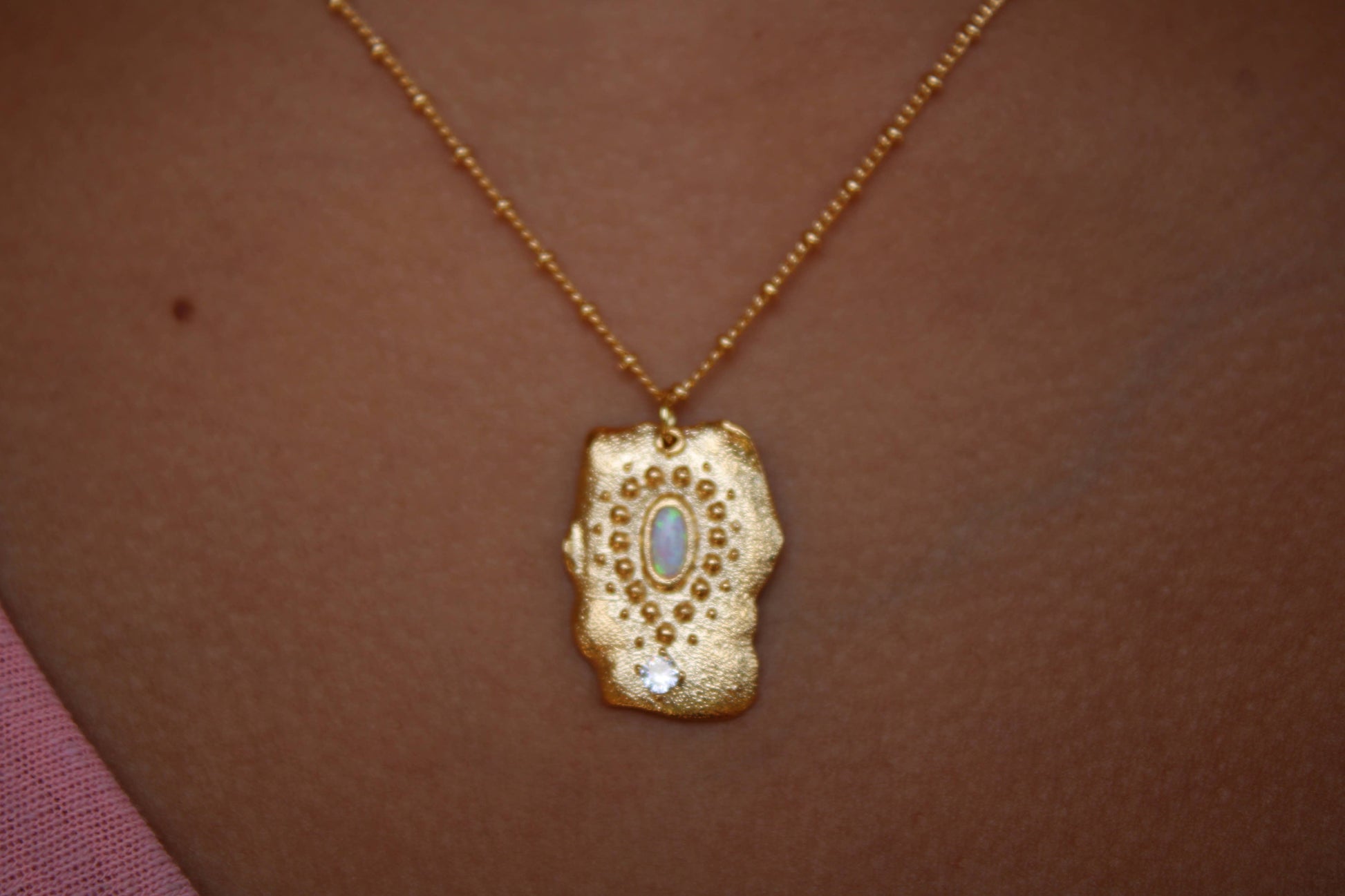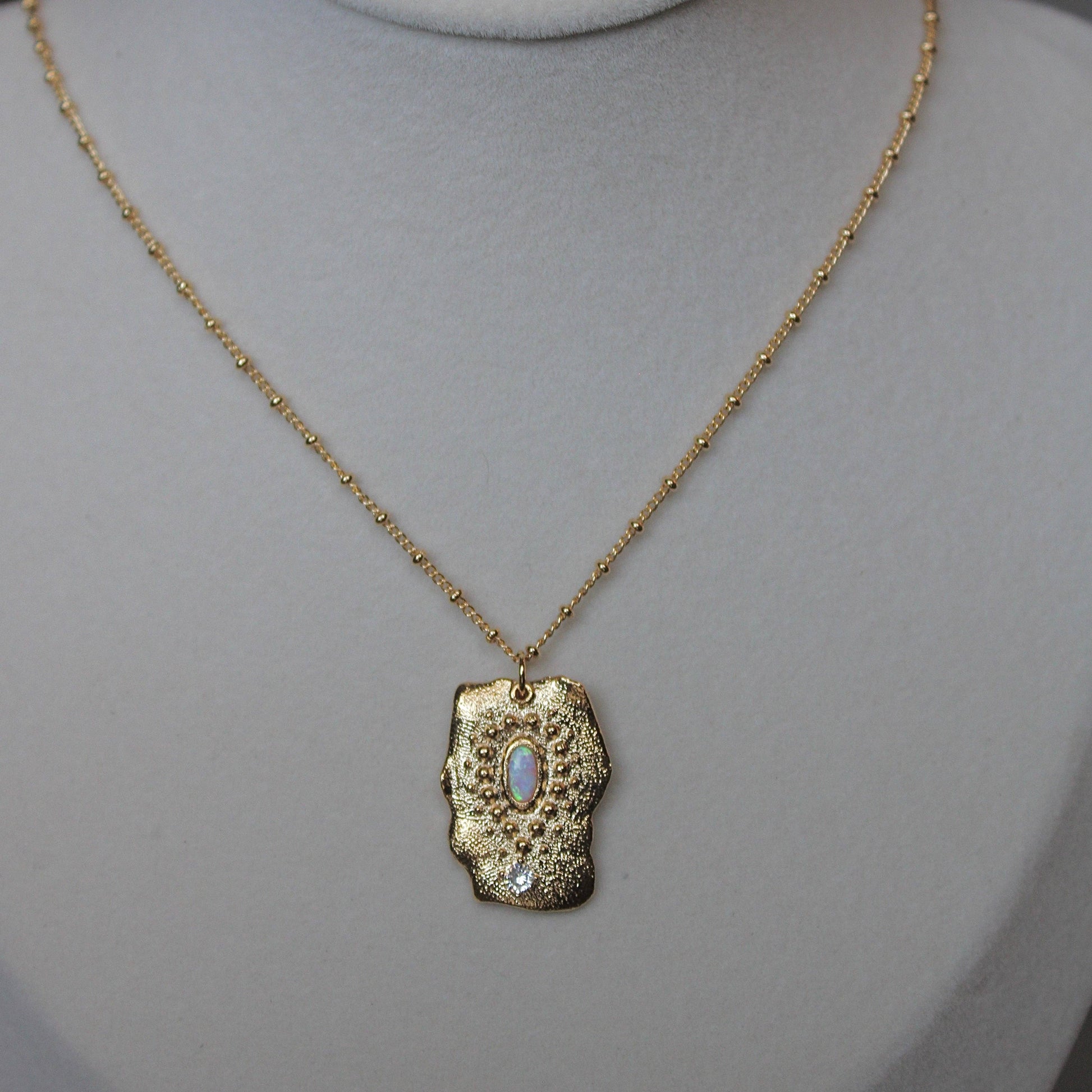 The Celestial Opal Pendant features a textured crystal and opal pendant on a gold filled satellite chain. Perfect for layering with others or styling solo. This is a beautiful gift.