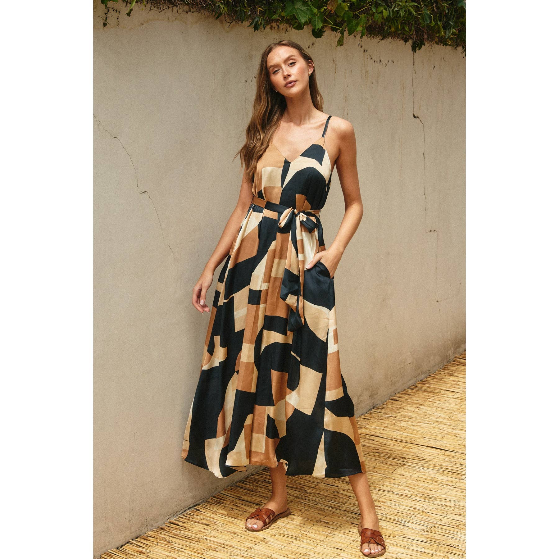 Step into the spotlight with the Geo Extra Flared Dress, where bold geometric prints meet a wildly flared hem that dances with every step. This maxi dress flaunts a dramatic A-line shape that’s as fun as it is flattering. Play with style using the detachable belt to cinch your waist just right, while the slender shoulder straps and cheeky V-neck on both front and back add a flirty touch. Perfect for twirling through parties or turning heads on a night out, this dress brings playful elegance to your wardrobe with a splash of wow!