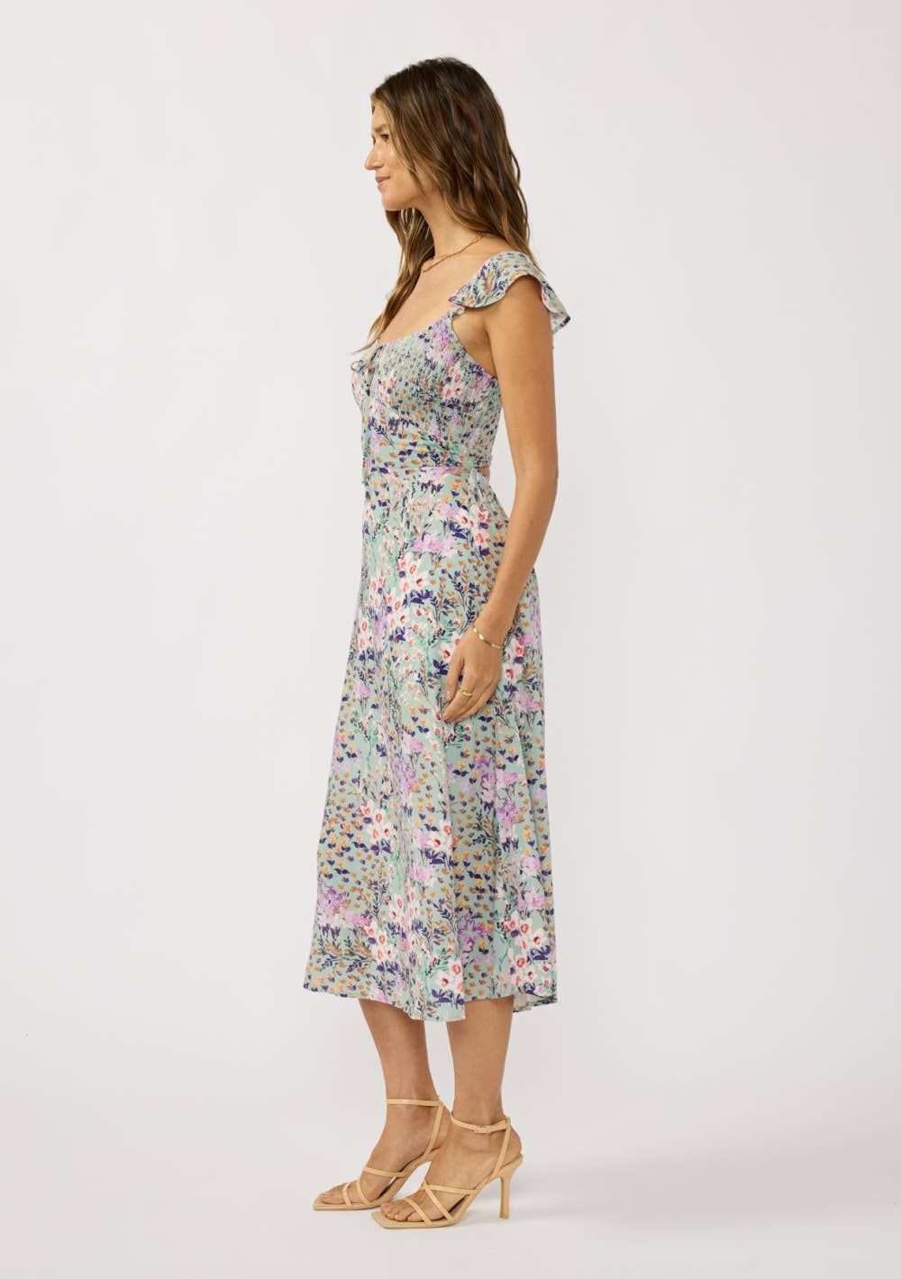 Embrace spring with this floral rayon slub midi dress, designed for relaxed elegance. The smocked bust with tie detail and ruffled sleeveless straps create a feminine silhouette, while hidden side pockets add practical comfort. A flowing skirt and strategic back cutout deliver movement and visual interest. Perfect for warm-weather styling that feels both effortless and intentional.