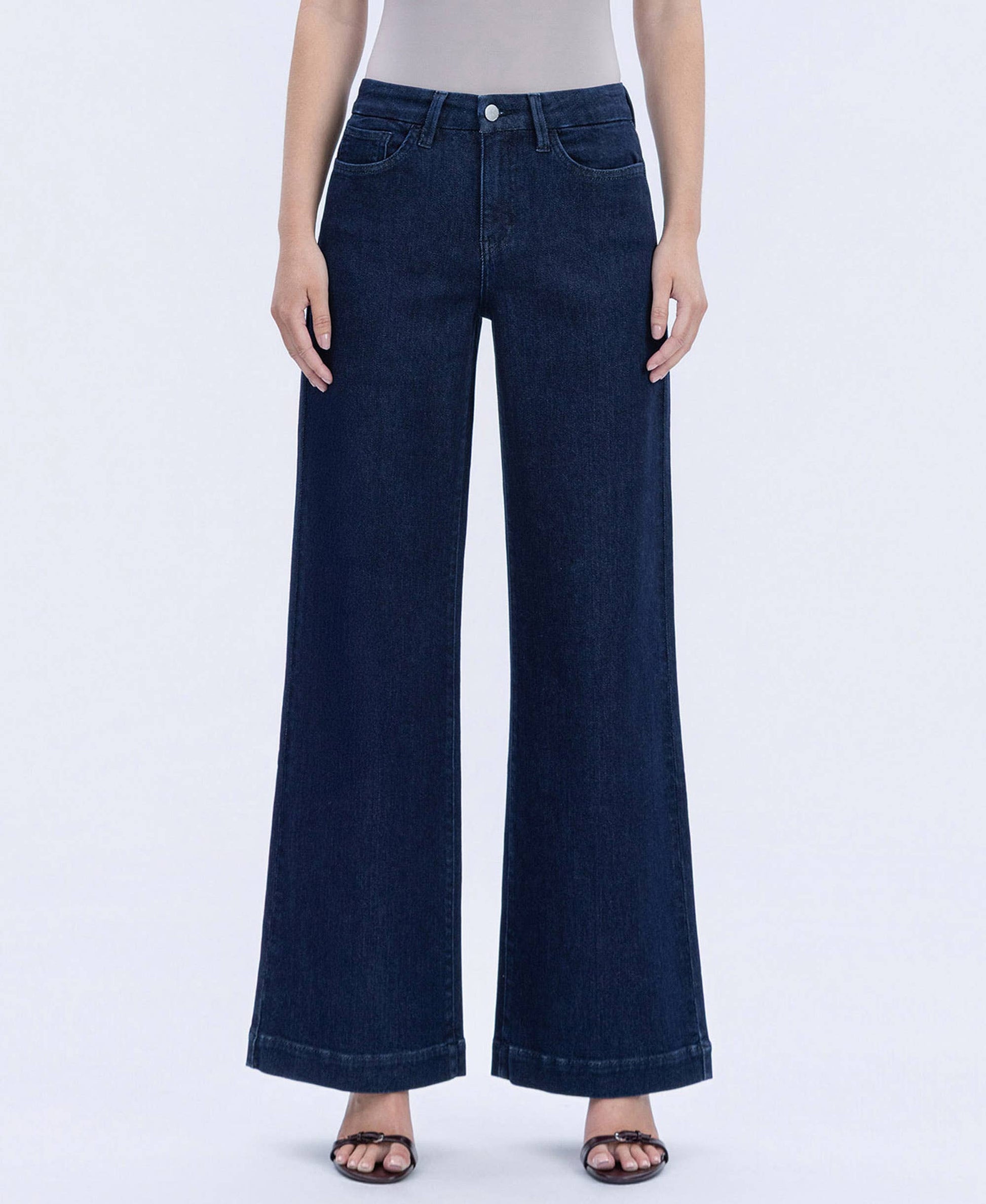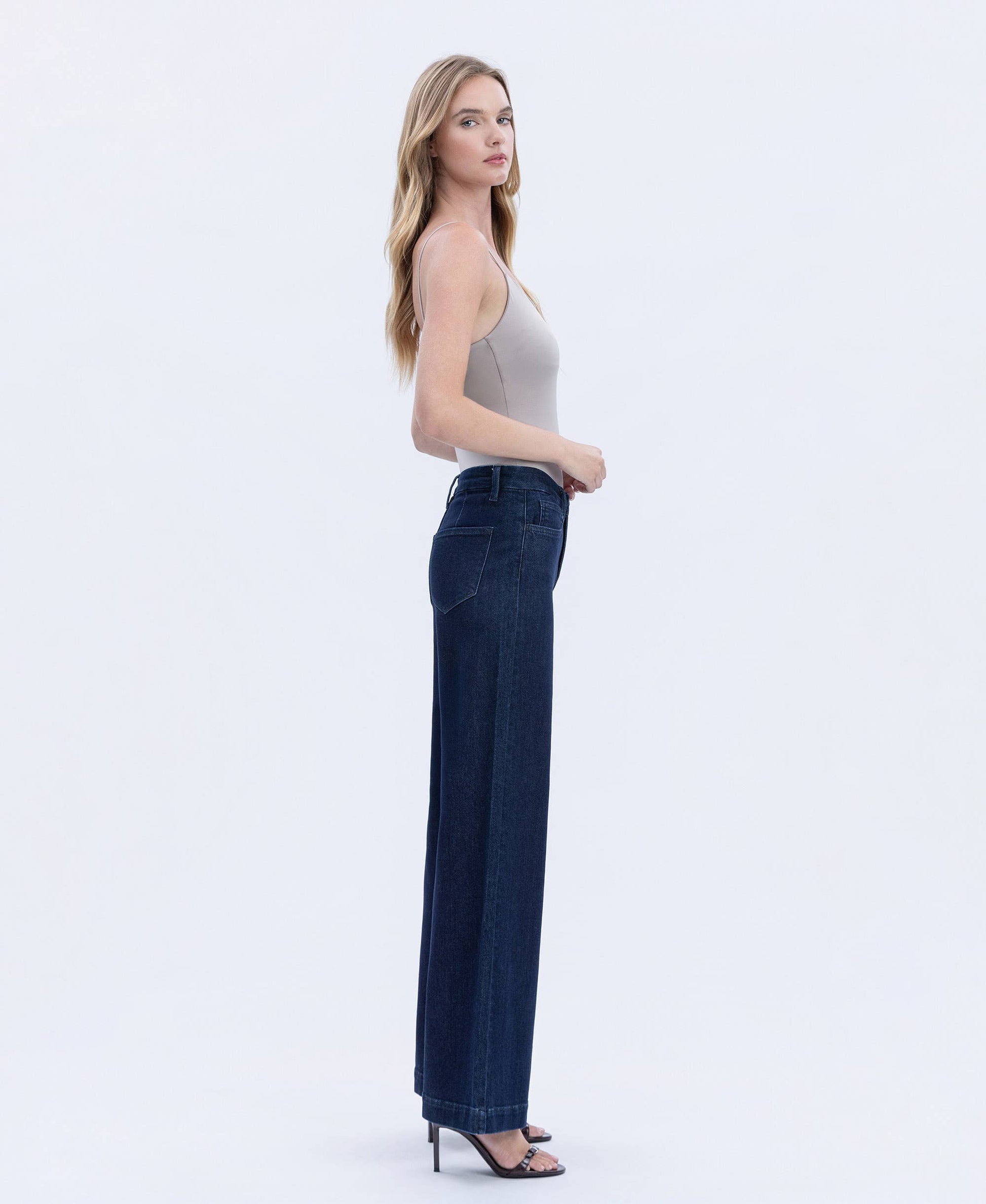 These wide leg jeans feature a high rise waist and a seamless waistband for a sleek, comfortable fit. Crafted from comfort stretch denim, they provide flexibility without sacrificing structure. The full length design with a trouser style hem adds a refined touch, making these jeans an excellent choice for everyday wear.