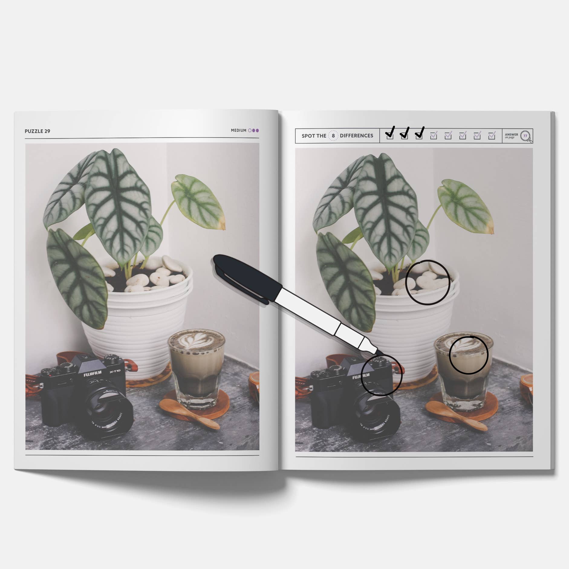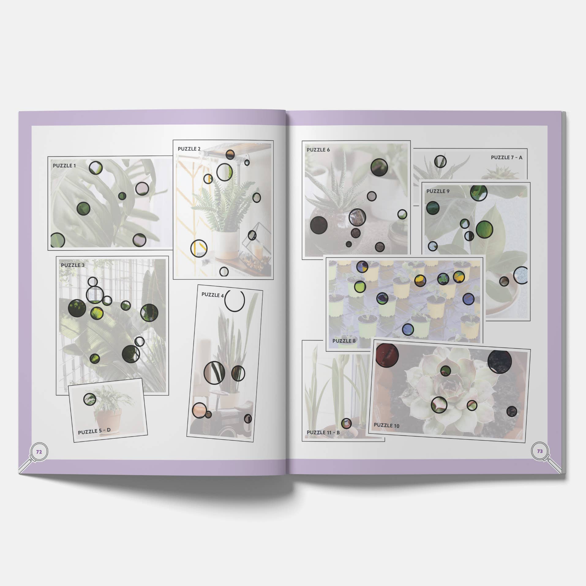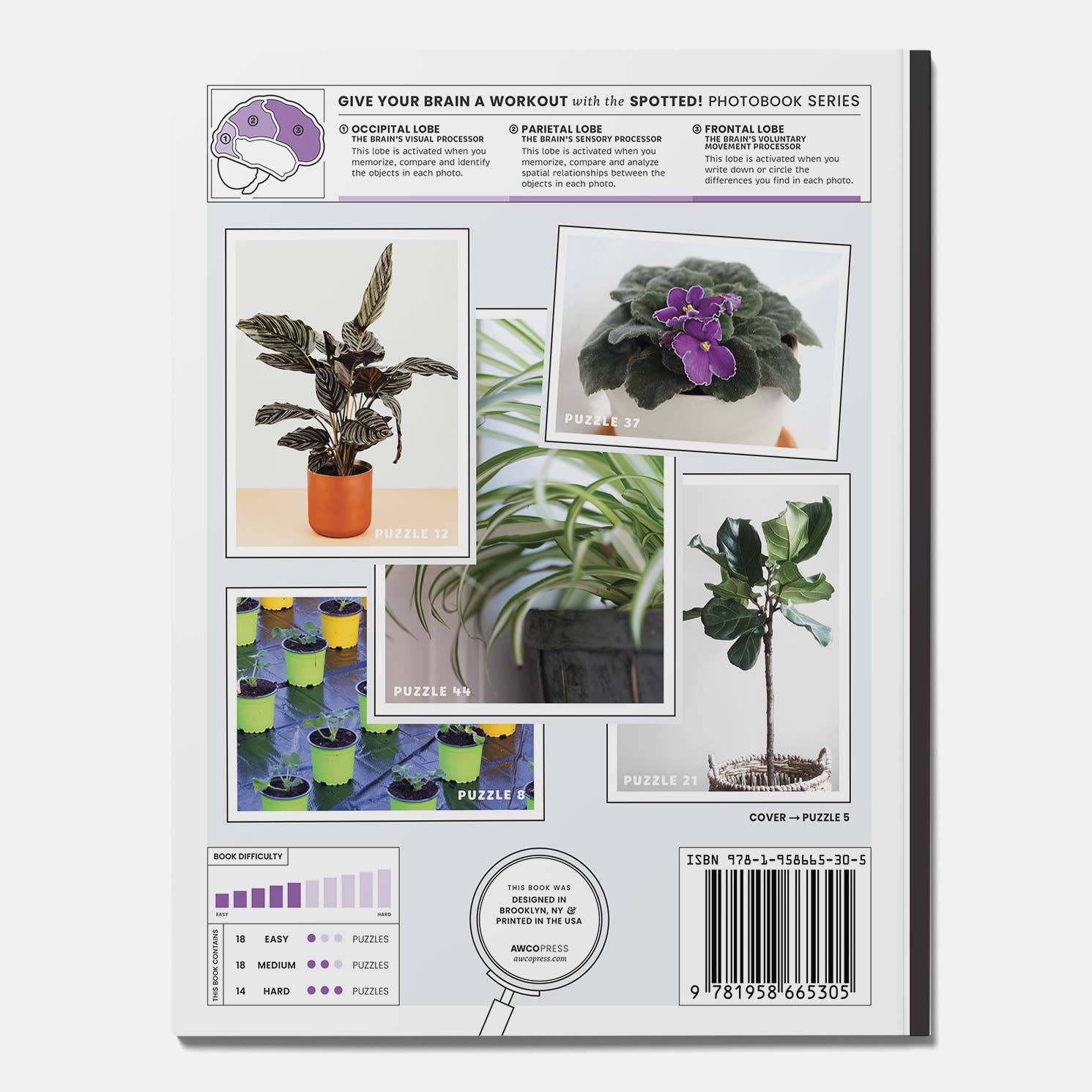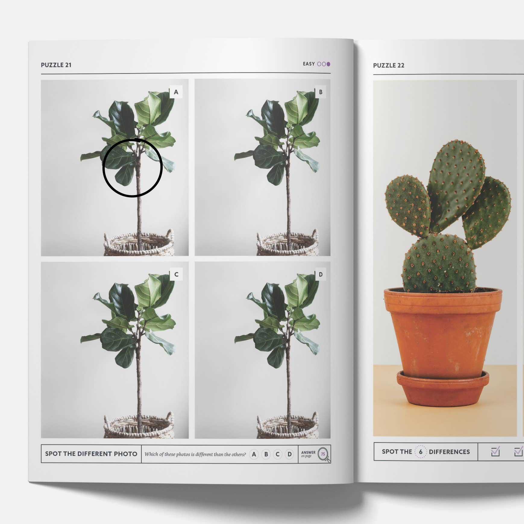 This find the difference book for teens & adults features 50 unique indoor plant-themed picture puzzles! Spot the difference puzzles are a great screen-free activity that help keep your brain in tip-top shape. In fact, three out of four of your brain lobes are activated every time you work on a puzzle! Take a peak at the back cover to learn more.