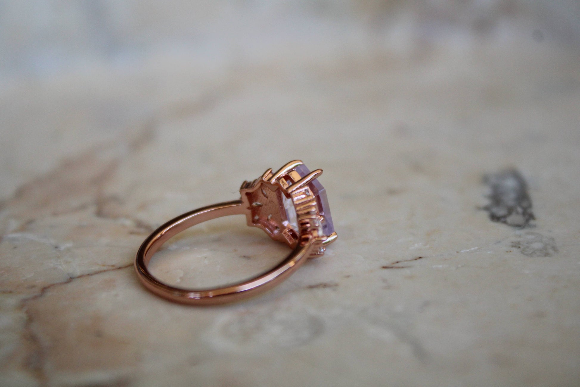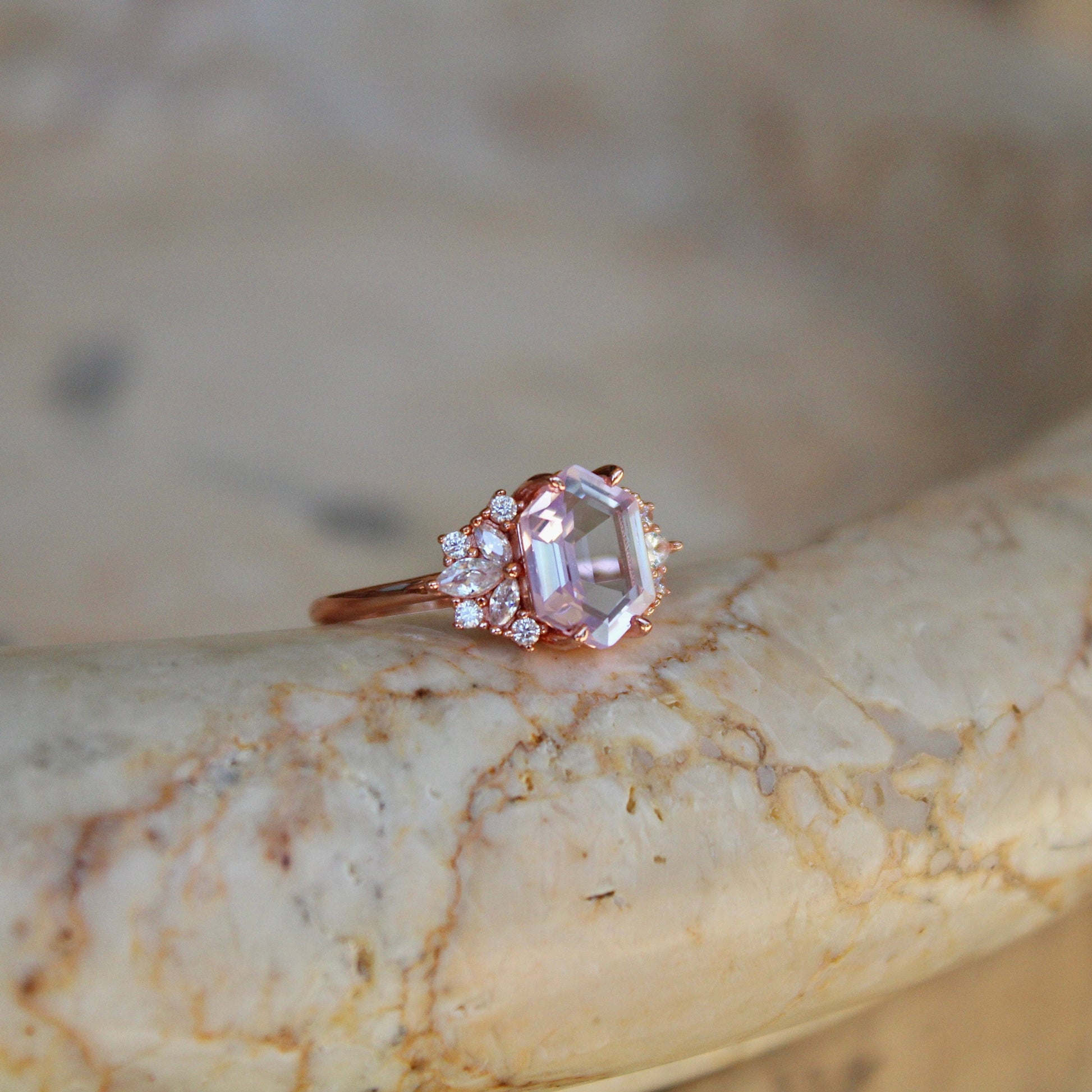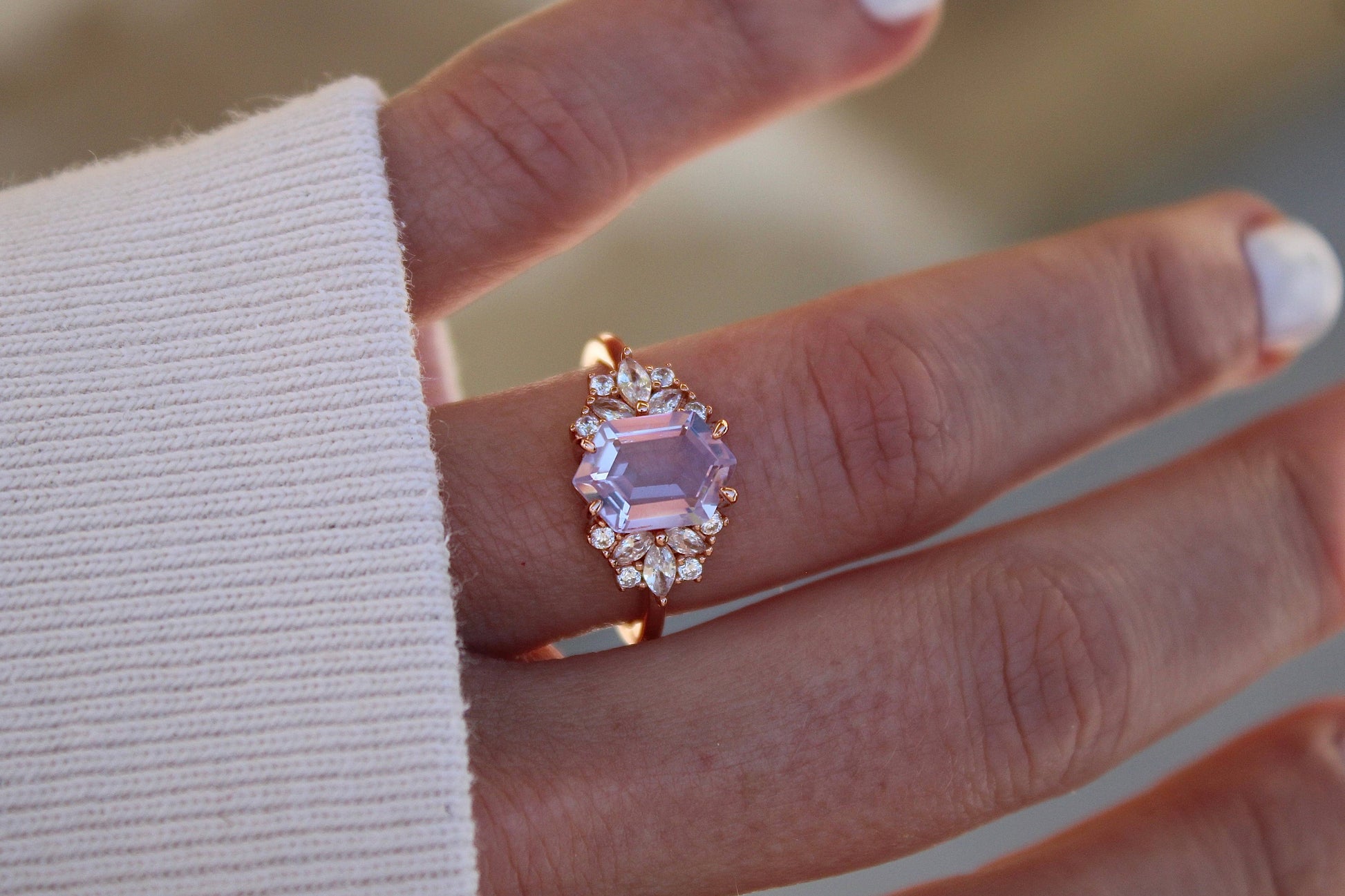 The Luna Lavender Quartz Floral ring features a stunning hexagon cut center stone surrounded by a bouquet of crystals.