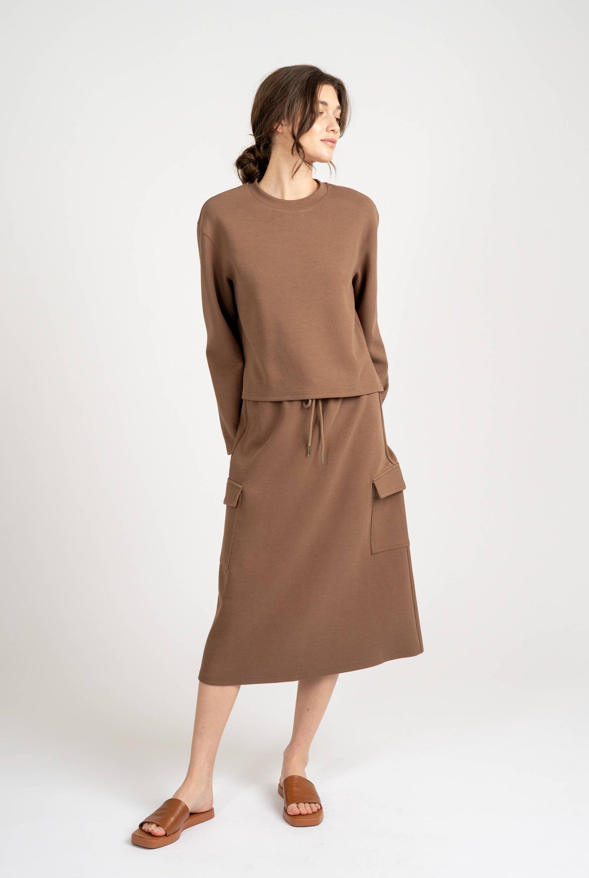 The ultimate in softness and stretchiness. This skirt is the perfect way to step up your go-to lounge wear. Featuring a relaxed fit, comfortable stretch, and high rise waist with elasticized drawstring waist.