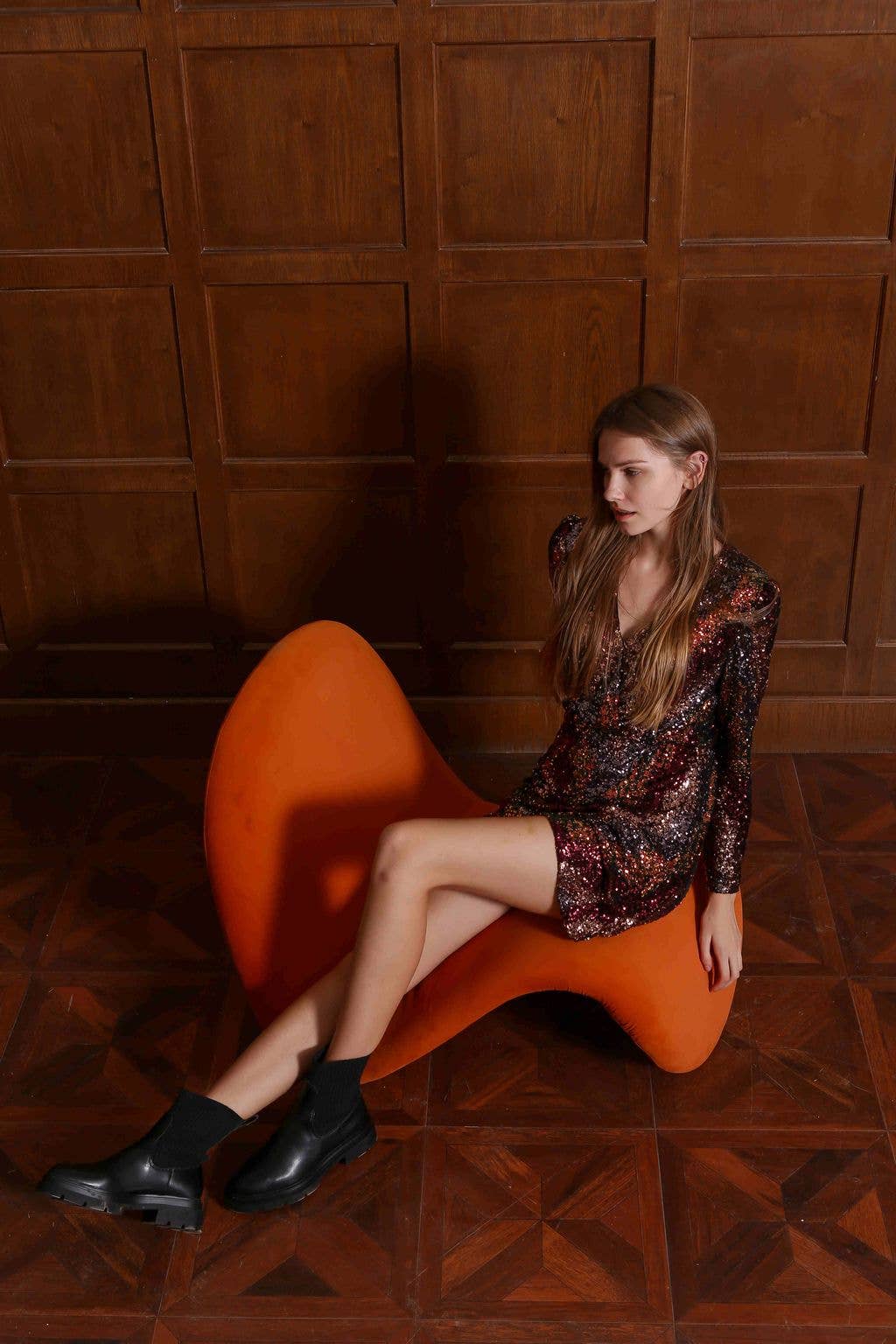 This chevron sequin dress has stunning deep shades of burgundy, gold, deep blue and green. This dress has a great silhouette suitable for many body types with a criss cross V-neck, long sleeve, subtle stretch, elastic at waist and long mini skirt.