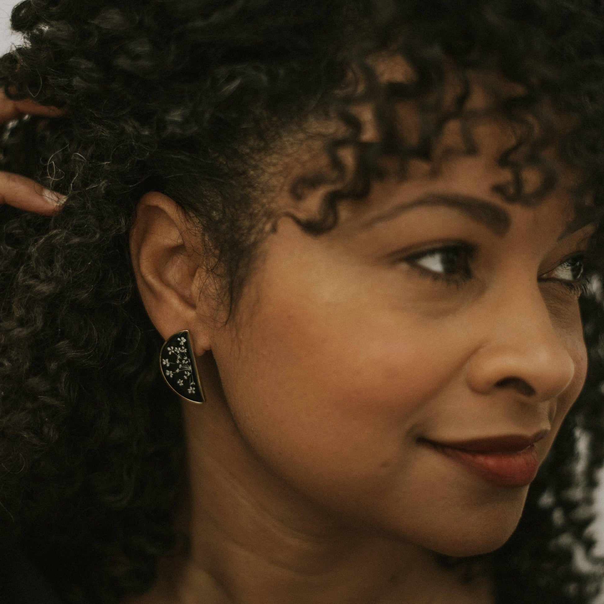 A single flower cut in half and encased inside of these slim half circle, brass frames. Available in clear with Daisy or black background with Queen Anne’s Lace. The Daisy is a symbol of hope. Queen Anne’s Lace is a symbol of sanctuary. Finished with surgical grade stainless steel posts.
