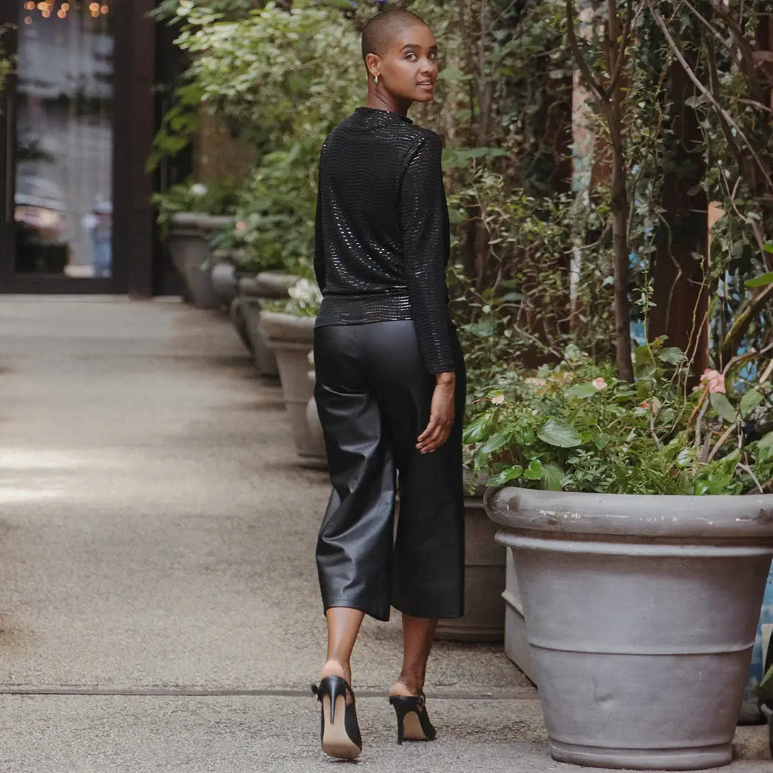 Carefree Travel Fabric - Soft Silky Knit w/ Reflective Embellishment, signature poly blend fibers offer luxurious softness with lightweight, wrinkle-free comfort. This easy-care fabric is quick drying and cooler than linen or cotton, making it perfect for on-the-go wear.
