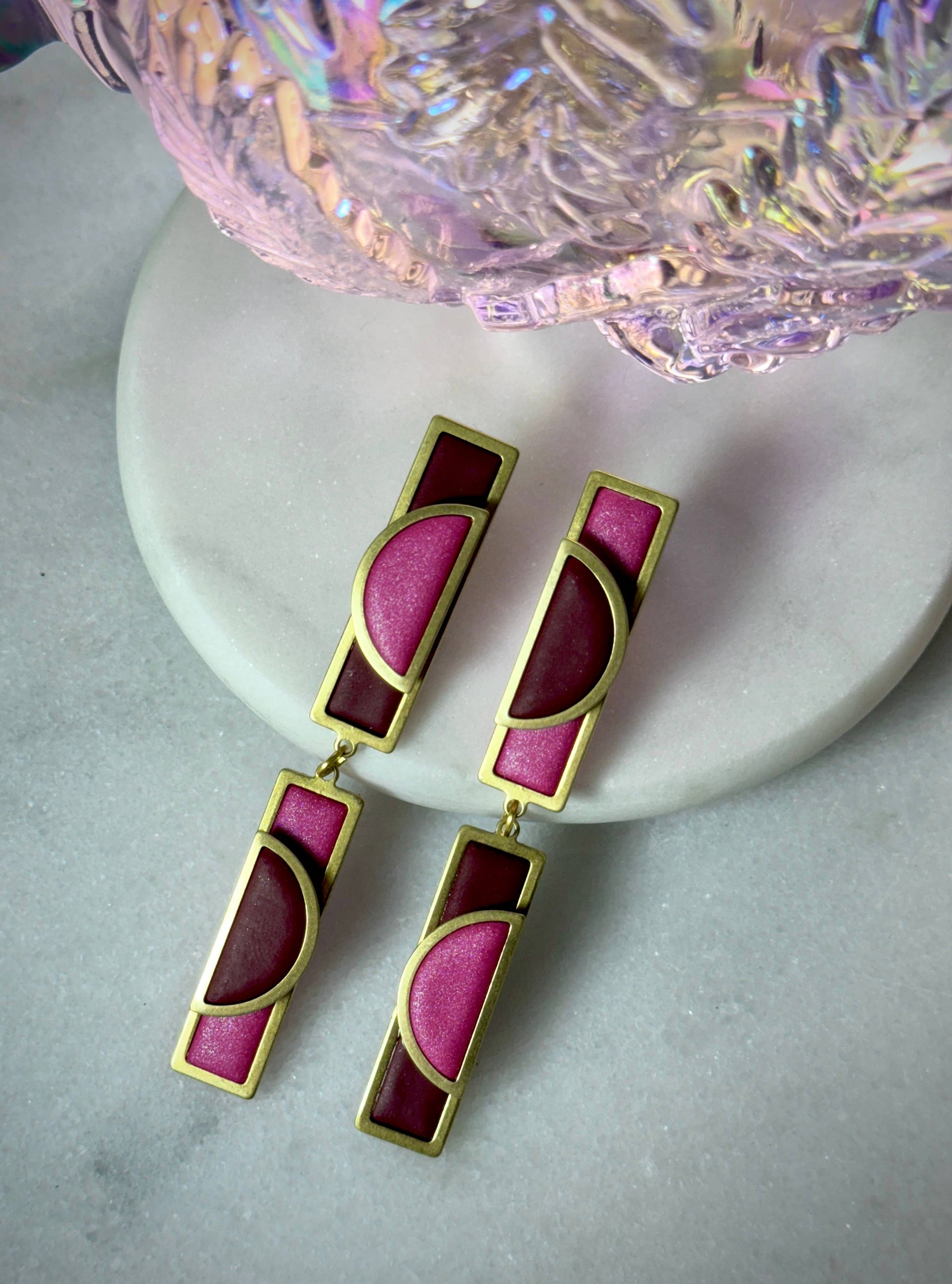 A modern take on Art Deco-inspired jewelry, using high-quality materials at accessible prices. Featuring geometric shapes and hand-mixed colorways in rich jewel tones, all Rhombusware Earrings are completely handmade by Rebekah in Los Angeles, California.