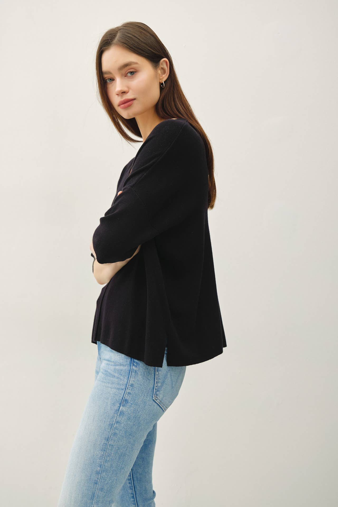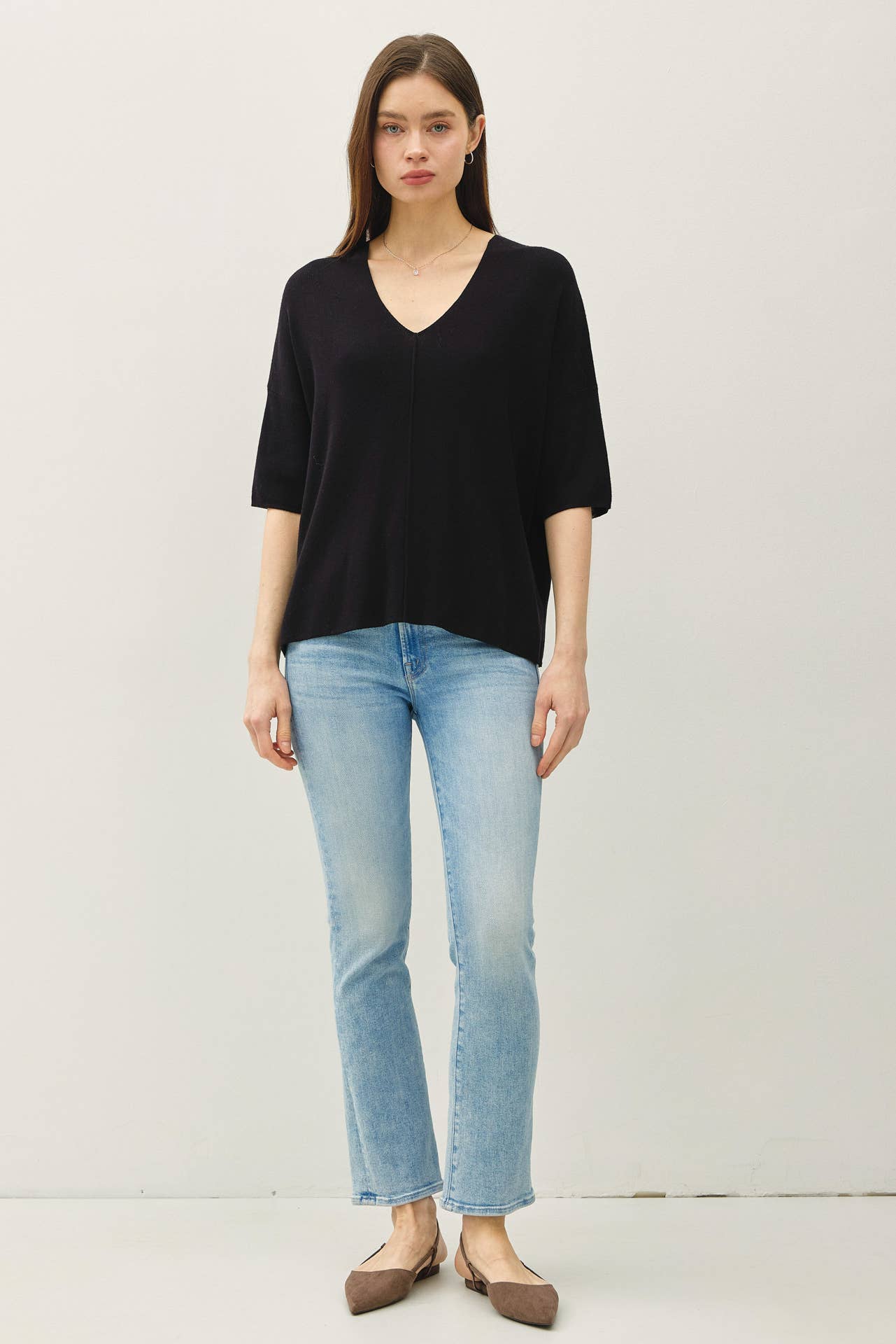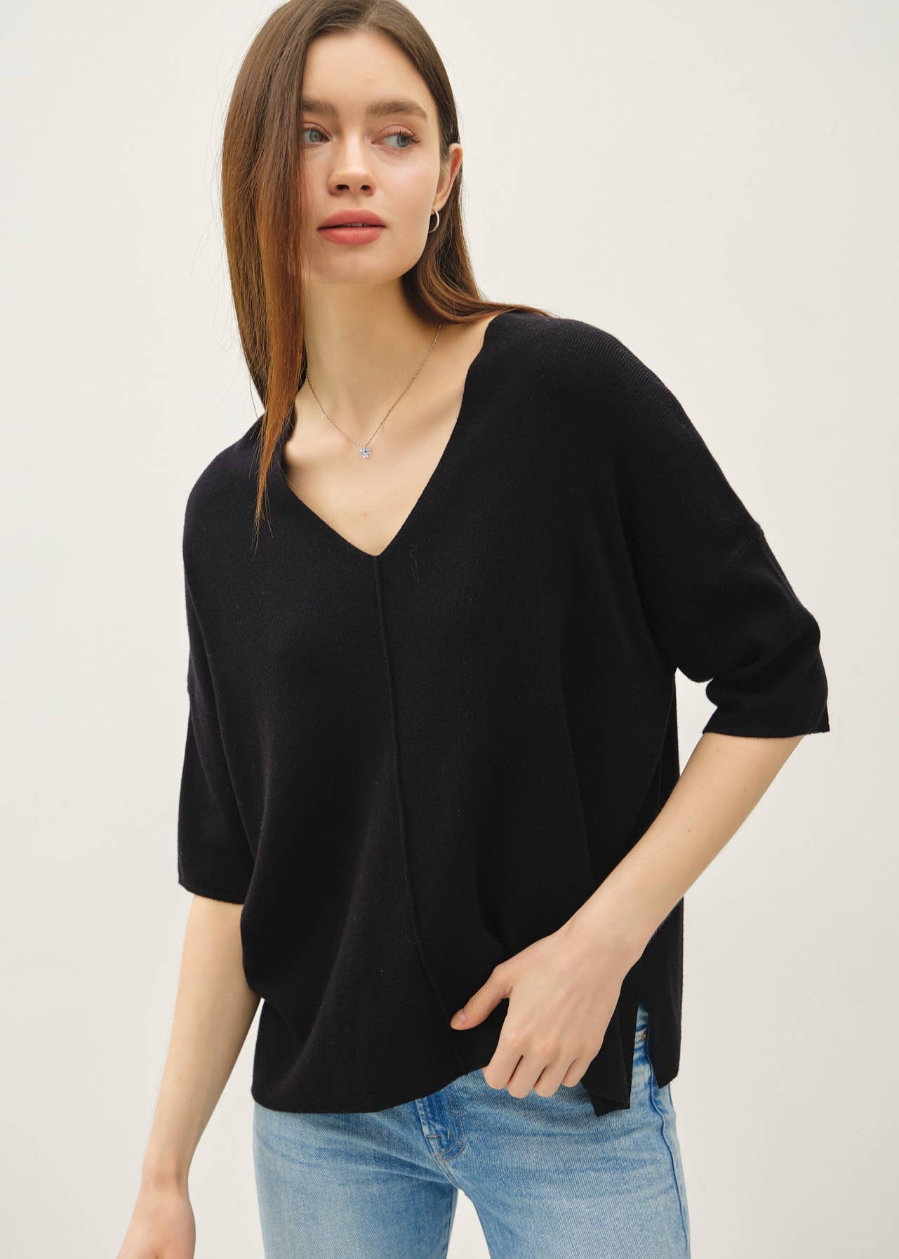 This effortless v-neck sweater can easily be dressed up or down. It is ultra soft and a nice weight for almost every season. Featuring a dropped shoulder, half sleeves, a center front exposed seam detail and a relaxed fit.