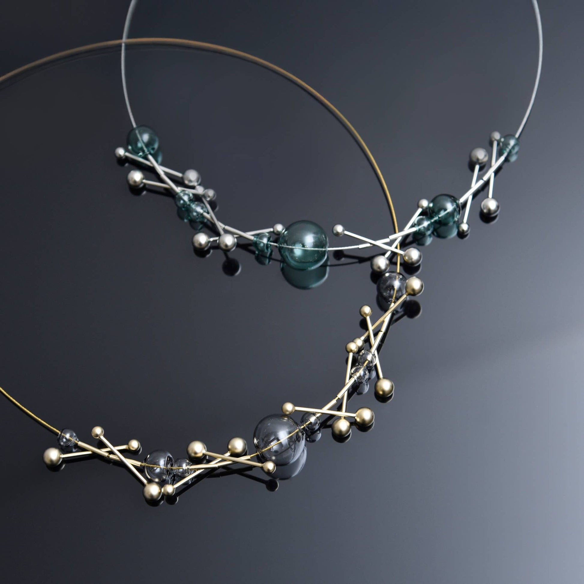 The Vevé Necklace is composed of multiple molecular-inspired elements and delicate glass beads, arranged to appear as if they are floating. Each component moves independently with the body, creating a light, kinetic rhythm. Vivid and dynamic, Vevé brings a sense of motion and modern elegance that pairs effortlessly with the Révé hoops.